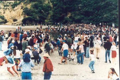 Crowds line both sides of the channel as the women engage in the tug of war.Collection