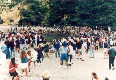 Crowds line both sides of the channel as the women engage in the tug of war.Collection