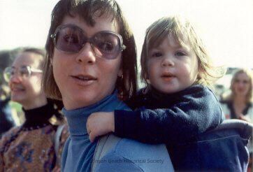 Close-up of Anne Rand wearing large sunglasses, dressed in a blue turtleneck, attending the Stinson Beach School dedication with Carlisle in a carryall on her back. Lorelei can be seen behind them.Collection