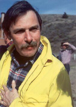 Kendrick Rand at the Stinson Beach School Dedication. He sports a moustache, yellow windbreaker over a blue and red plaid shirt and is holding his hand to the center of his chest.Collection