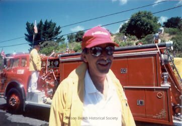 Kendrick Rand smiles at the camera from behind sunglasses and under his red Fire Dept. cap. He is wearing a yellow windbreaker. Behind him is a red fire engine with an elderly gentleman dressed similarly standing on the side of it.Collection