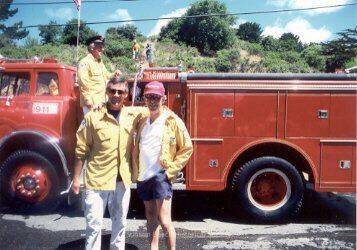 Kevin Hicks (L) and Kendrick Rand (R) stand shoulder to shoulder in front of a shiny red fire truck. Kendrick is wearing blue shorts, white shirt and yellow windbreaker. Kevin also has on a yellow FD-issue windbreaker and white chinos. Elderly man in a captain's hat stands on the fire truck behind them. Hikers/spectators can be seen coming down the hill behind them. It is the 4th of July in Bolinas.Collection