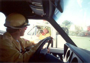 A color photographic print of Kendrick Rand sitting inside of a fire truck with one hand on the side window rail and his right hand on the steering wheel. We see the back of his head as he talks to Pat Norton who is driving another fire truck going in the opposite direction.Collection