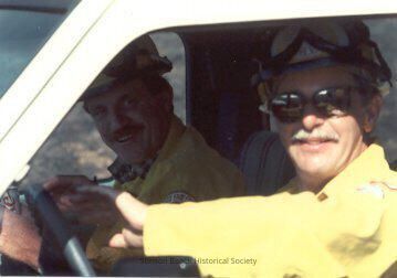 A color photographic print of Kendrick Rand in the driver's seat of the fire truck facing the camera and smiling. He is wearing the yellow firemen's uniform and hard hat. He has a pair of dark sun glasses on and a dark pair of firemen's goggles is on his hard hat. On the passenger seat out of the sun, Kenny Stevens is sitting and looking at the camera.Collection