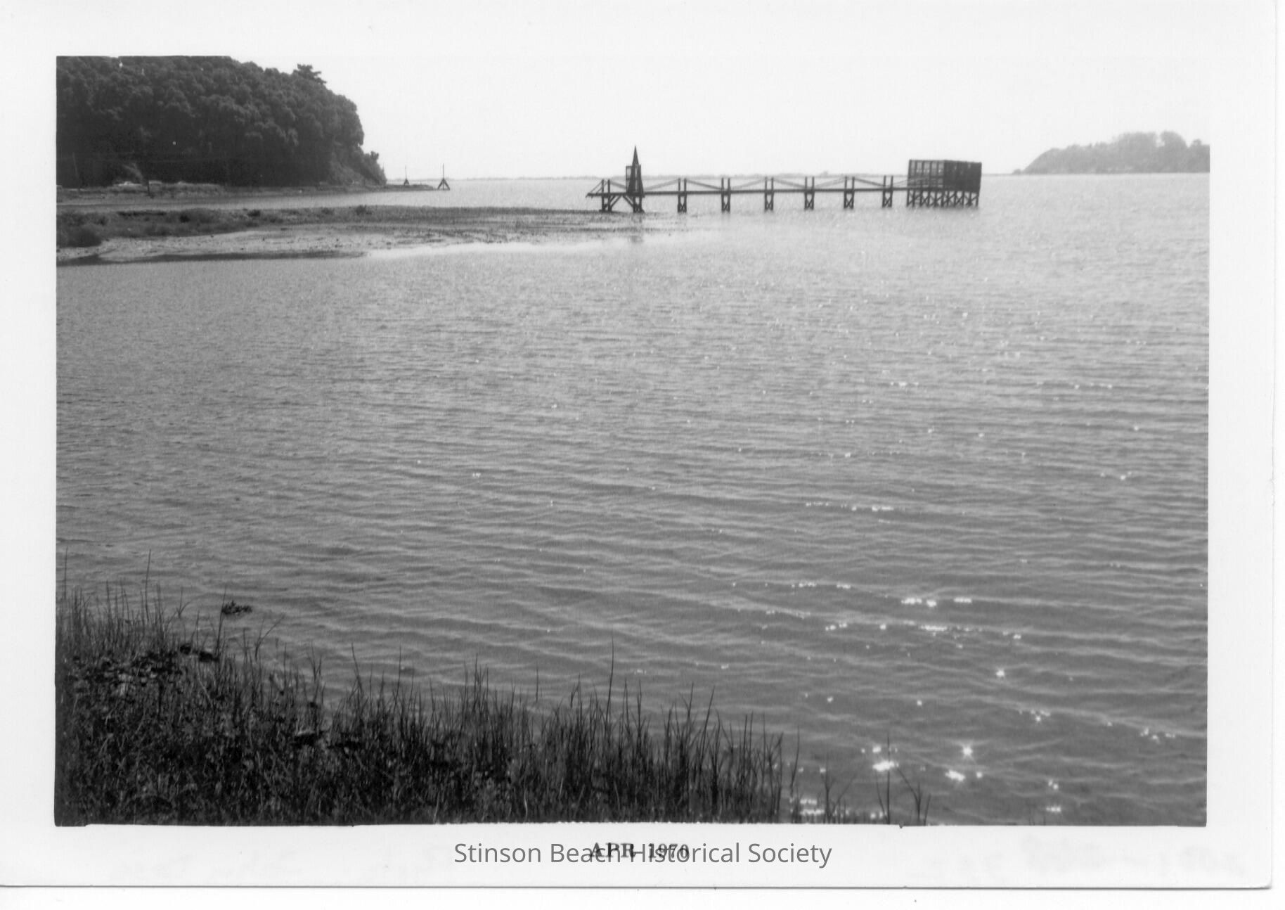 A black and white photographic print of Bolinas Lagoon near present Volunteer Canyon of Audubon Canyon Ranch. It shows a pier with a gate closer to the shore and fenced in area, probably a duck blind, at the lagoon end. The photograph has April 70 printed on the bottom. On the back of the print, "Donated by Margot Patterson Doss" is stamped and written photo: John Doss. Margot Patterson Doss who went by her maiden name of Margot Patterson was a well known San Francisco Chronicle columnist of "Bay Area at Your Feet". In that capacity, she brought an appreciation of nature, wildlife and the trails of the Bay Area to people. She and her medical doctor husband, John Doss, had a house in Bolinas and later retired there.Collection