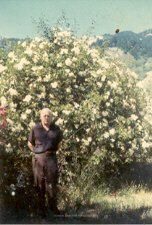 Color photo of man standing in front of a flowering bush (rose)? with the Stinson ridge in the background. The man is wearing a dark blue short sleeve shirt and brown pants. The flowers are light pink. On the back of photo, "Arthur Jesse, 6/68" is written in black pen.Collection