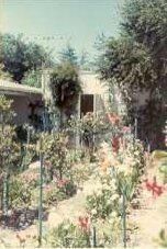 Small color photo of the garden by the house at 17 Marine Way in June 1968. A variety of red, white and yellow blooms in staked rows at the side (or rear) of the house. A square white structure with its door open sits at the rear, flanked by a tall evergreen on the right and a smaller one to the left of the door. A bit of the main house is visible on the left.Collection
