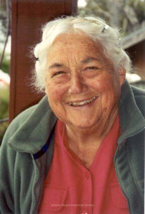 A color photographic print of Nancy Sullivan taken at time of Oral History interview. White haired and ruddy faced lady is smiling. She is wearing a green jacket over a red shirt.Collection