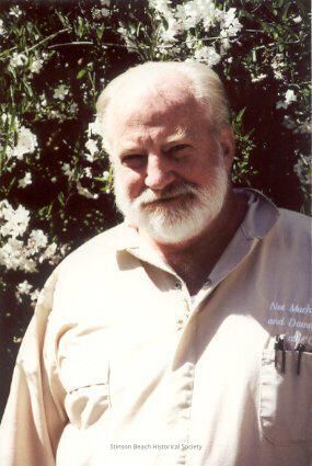 A color photographic print of George Flynn, MD at the time or his oral history interview by Sally Veauta. A white haired bearded man stands in front of potato vine. George Flynn lived in Stinson Beach since early 1970's when he was an emergency room surgeon. He became the town doctor who served the community, often without pay.Collection