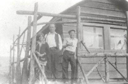 A black and white photographic print. A girl (Dorothy Eggers) about 10 years old in a winter jacket, her father, Edward Eggers in shirts and the vest, and her brother, Edward Davis Eggers in shirt and pants stand under a small sapling temporaly gate structure adjasent to the Aunt Jenny Spencer's "shack" which is "across from Upton's" that is on the Old Town hill overlooking beach, on Lincoln Street.Collection