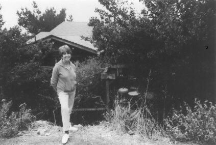 Black and white photographic print of Dorothy Eggers (De Maria) standing in the side yard of her aunt Jennie's house across from Upton's on Lincoln Ave. The house behind her is surrounded by oak and pine trees. On its small deck, there are 2 Weber-like BBQ grills. She is standing in the middle of the foreground with her hands behind. She is wearing a light colored pants and a hooded sweatshirt.Collection