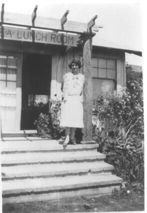 In this black and white photographic print, a young unknown lady stands on the front porch of the "Tea Room" by the lagoon. On the trellis by the entry a sign "Tea Lunch Room" hangs. There are 4 step risers in front of the porch. She is wearing a summer dress. The landscaping along the porch is tended. The tea room was operated by McKennan's who also operated a boat launch to Bolinas.Collection