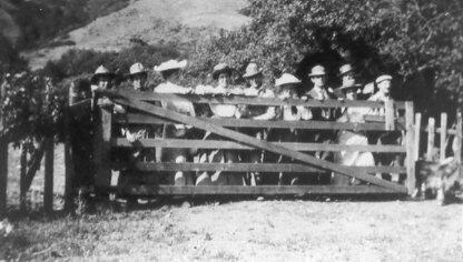 A black and white photographic reproduction was made from the original of Maybelle Kelly. The photograph shows a group of 10 hikers lined up on the far side of a large gate, perhaps a cattle gate. The gate is situated at the bottom of the hill near present community center. Six men and 4 women are dressed in Victorian-style hats and/or dresses. A sheep dog is at the opening of the fence.Collection