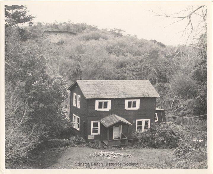 A black and white photographic print of a 2 story house in canyon, probably taken during the storm of 1956 winter. The small wing of the house attached to the right of the house is torn from its foundation, probably due to the storm. The hill behind the house has a mark of small landslide. The house sits in the bottom of a canyon surrounded by dense foliage. The house could have been one of the houses in the canyon next to the Lacaze House, 2009-104-02. Stamped on the back, Jan 21,1956.Collection