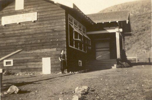 Stinson Beach schoolhouse in 1921 was a wooden barn-looking structure with slanted roof and windows on south-facing side. The windows, which lift outward, are open. Beyond them there are a few steps up to a small porch with a door into the school house. There is also a small white door at the west-facing right corner of the building and similar opening at the very center top, beneath which is a Stinson Beach School sign. The ground surrounding the building is bare except for a few large rocks, perhaps demarking a pathway to the steps. A hill rises up beyond it. At the corner of the building a woman is standing with her hands in the pockets of her dark below-the-knee dress. She is identified on the back of the photo as Louise Avera. The date is Nov. 23, 1921.Collection