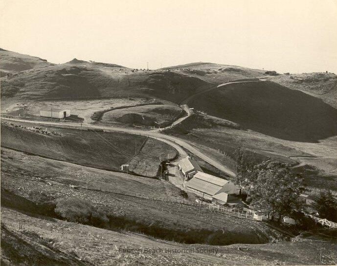 Panoramic view of the White Gate Ranch house and barn taken from the hill above the north of the Ranch. The house, two larger barns and the eucalyptus trees which still stand today are on the right front, Panoramic Highway crosses diagonally on the photograph. A wide ranch road from the house crosses the highway to join present-day Dipsea trail. In the middle left of the print another smaller ranch building stands, the electrical line connecting it to the house. In the upper left is the present-day fire road which leads to an old Bunker site of World War ll and part of present Dipsea Trail. Cows are grazing on the far hills toward ocean. Dated in ink 11-7-48 on the back.Collection