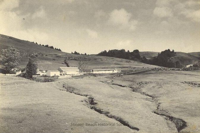 Another long view of White Gate Ranch buildings showing deep faultlines radiating downhill from the nearest barn buildings. Fencing separates the barns and other buildings from the ruptured hillside.Collection