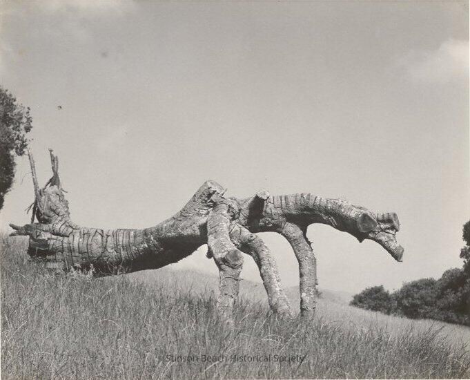 It is an artistic photograph of a large tree trunk laying on a grassy field. A large sky area behind and some trees are both sides of the subject. The trunk lays like a dinosaur. On the back the photographer has noted: May 23 1959 Chevron Isopan F. Radinal 75:1 aero#1 50/8.Collection