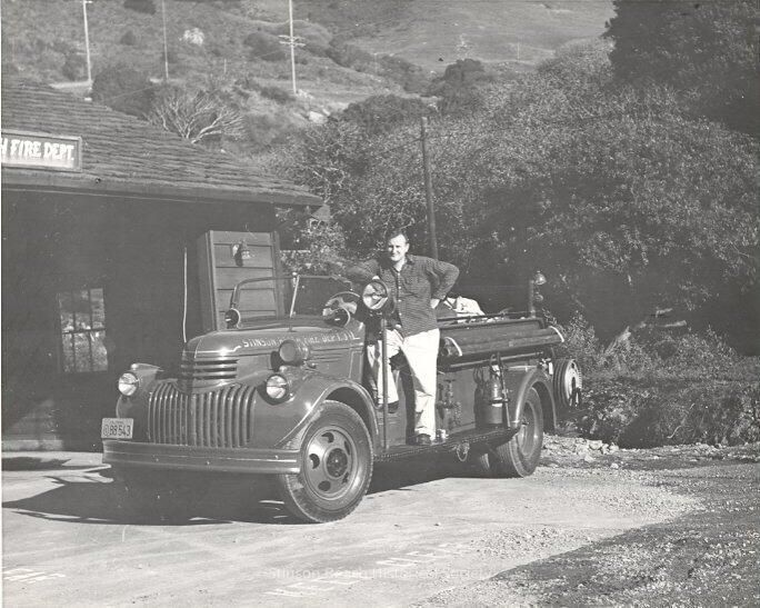 Robert Airey wearing a checked shirt and khaki pants stands on the running board of a fire truck parked in front of the Fire Station. He is leaning one elbow on the top of the windshield and resting one foot into the open truck. His other hand rests on his hip. The fire truck is carrying hoses and a fire extinguisher with a small bell visible at the rear. In the background are trees and open hillside with telephone poles.Collection