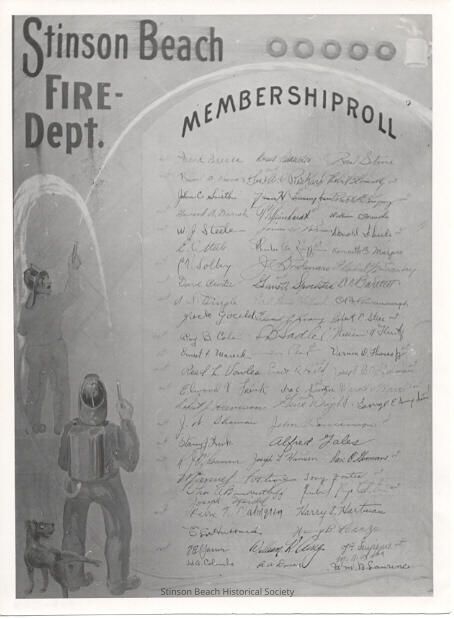 A black and white photographic copy of original document with illustrations showing signatures of the Stinson Beach Fire Dept. memberships plus illustration of two firemen and a dog at work. It includes 70 signatures including William R. Airey who was the Fire Chief. Title above reads Stinson Beach Fire Dept. Membership Roll. The original was believed to be hung inside of the fire house. 1993-248 is a similar object but different year. On the back L.Airey is written in pencil indicating it belonged to Louise Airey, wife of William R. Airey.Collection