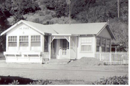 A black and white photograph of a tea-room, or tea house known as the Pines. It was operated by McKinnon family in earlier time. The building set on a flat with a dirt road and a pile of dirt in front. L shaped building has a sign under the front gable with a light that read THE PINES. The building looks new or just being remodeled. The tea house was known as The Pines or The Lagoon in various times. See 1993-355, 2001-355 to 356, 2003A-123.Collection