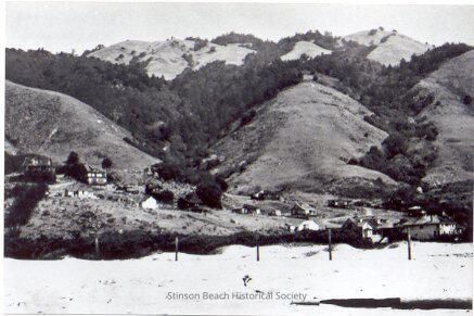 A black and white photographs of Stinson hills dotted by houses. The photograph was taken from the beach showing the Airey's Store building at the lower right, back of sand dunes and the Judge Archie Upton's large house to the left on the hill. 14 or 15 houses are shown all together. The print was printed reversed in mirror image by the reproducer, but it is "un-reversed" here to be seen correctly.Collection