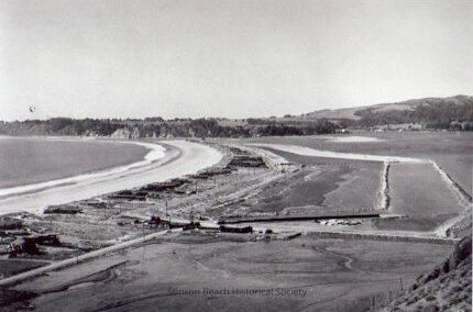 This black and white photo shows the creation of man-made Seadrift Lagoon in 1956. Sand berm in the shape of the lagoon and Dipsea Road side development is made to hold the water in and the filling of land. Quite few houses are already built on the ocean side of the Seadrift Road but non on the Lagoon side. The crescent of the beach and Bolinas could be seen to the left of the photo.Collection