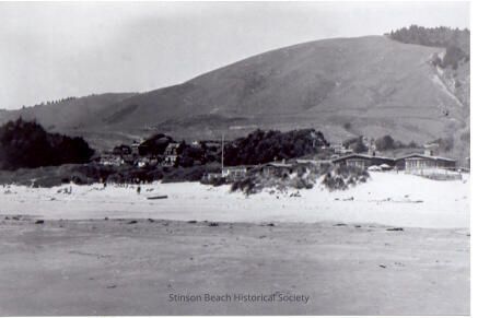 A black and white photograph taken from the wet sand of the beach looking at the Seadown. 4 rental cottages are lined up in front with the Seadown with its flag pole at about the center of the picture. Behind them on the hill you can spot 10 or 12 houses.Collection