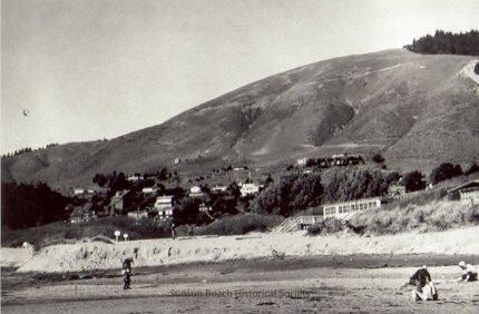 The print was printed reversed in mirror image by the reproducer, but it is "un-reversed" here to be seen correctly. The photo shows 3 beachcombers in front, Seadowns and one of the cabins in the center right, with the houses of Stinson Beach hills in middle ground and the hills and the sky in background.Collection