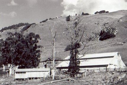 A black and white photograph showing the large White Gate Ranch Barn, an accessory building and eucalyptus trees in front. The ranch house sits at the left of the barn somewhat obscured by the barn building. The hills and sky occupies the rest.Collection