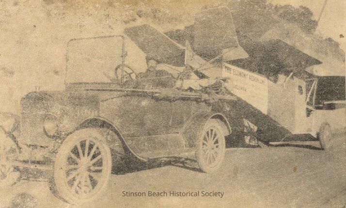This faded, damaged black and white photograph shows a jeep type vehicle with spoked wheels towing an aeroplane on which side panel has painted sign: The Economy Aeroplane, next line illegible, Sellmer, and next few lines illegible. The plane is on diagonal on its wheels and the tail resting on the back of vehicle. The wings are folded and swing on top of the plane parallel to its body. The driver of the vehicle (J P Sellmer) has moustache and wears a workman's cap. The hill with vegetation is in background. Its back caption written in ball-point pen reads: 1926 J P Sellmer Towing the "Economy Aeroplane".Collection