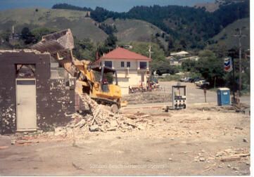 A color photographic print of the Stinson Beach Chevron Gas Station being demolished. KN Corp. who did not have the proper permit started the demolition of the whole building when the corner of roof was inadvertently torn by the bulldozer which was working on the replacement of pumps. Ensuing controversy ended town with no gasoline station. The site was reconvened to Proctor Jones' Snug Nugget Partnership which eventually bought by well to do citizens of Stinson Beach and donated to the town as Village Green II (Completed on Nov.2003) site.Collection