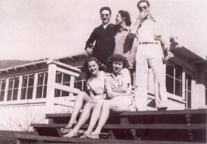 A small black and white photograph of 3 young ladies and 2 young men standing on the deck of the Sea Downs. The ocean side of the building shown is devoid of decorations nor signs except its paned windows. On its back "Top Gimi Sassi, Mary Reston, Hellen Irish, Louise Nave at the Sea Downs" is written in indelible pen.Collection