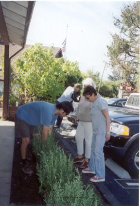 Toby Bisson emplants some shrubbery in the dirt while Sandra Francis (in back) and unidentified woman look on.Collection