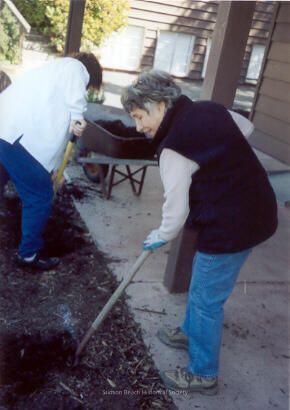 Beth Perry in black vest and blue jeans rakes down the earth in preparation for planting. There is a second person doing the same thing but we can only see her from behind. A semi-full wheelbarrow of soil stands on the cement.Collection