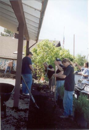 We've got a row of workers either digging holes for plantings or checking to make sure it's done right.Collection