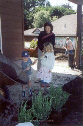 Woman (brunette in dark sweater) smiles down on her kids (a blond girl watching her little brother shovel dirt out of the wheelbarrow).Collection
