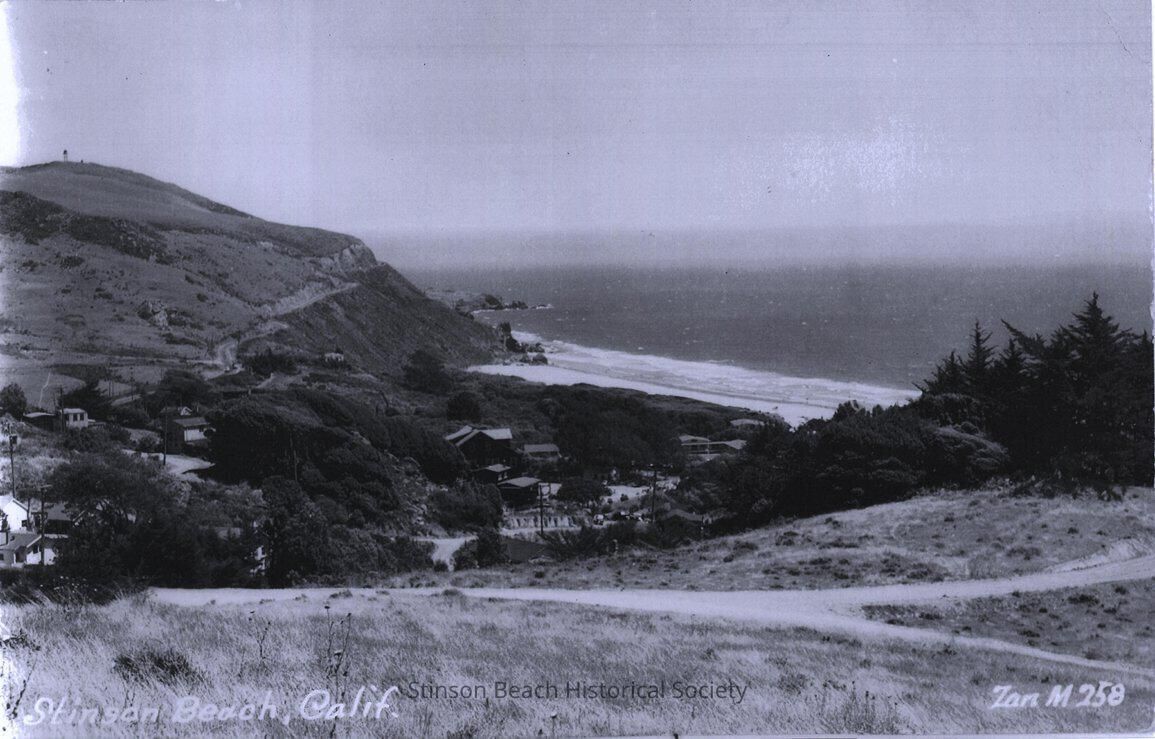 An enlarged Xerox print of a black and white postcard showing houses of Stinson Beach and Highway One. The photograph is taken from the present Highland hill looking toward San Francisco. There is a water tower, probably belonging to the White Gate Ranch, on the top of hill above the winding Highway One. The Steep Ravin cabin area (without cabins) juts out to the ocean from behind the hill. Panoramic Highway meets Highway One at the Lansberg and Smith houses. The houses along Calle del Mar to the beach are shown in the middle of the photo. The title, "Stinson Beach, Calif." and the identification, "Zan M 258" is printed in white in the lower left and right of the postcard.Collection