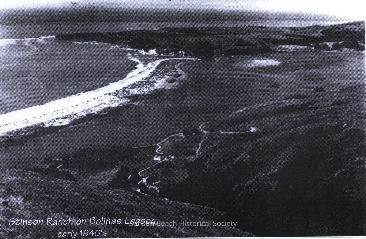 An enlarged Xerox print of a black and white postcard showing Bolinas Mesa, Stinson Beach spit, Bolinas Lagoon and Stinson Ranch and its roads. The photograph is taken from the hill above the ranch looking down. The spit is devoid of any development. The title , "Stinson Ranch on Bolinas Lagoon early 1940's" is printed in white on the lower left of the postcard.Collection