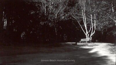 Photo is very dark but an empty park bench resting beneath a thin-branched tree in a slim ray of sun is visible. Old Mill Park sits at the bottom of the stairs where the Dipsea Race begins its uphill climb.Collection
