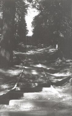 The first flight of wood-separated dirt stairs rises in an allee of trees.Collection