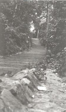 The second flight of stairs bends up through more foliage. Large rocks border the stairs at the lower level.Collection