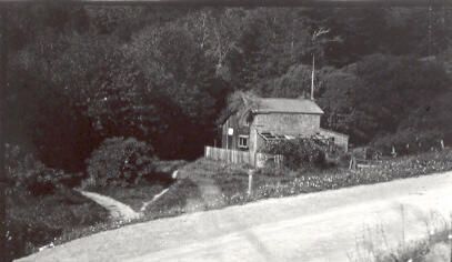A large shingled structure with a slant roof sits slightly back from the road on a sloped hillside. There is a dense growth of trees beyond it and below on the left the creek meanders into the trees. The house is surrounded by a wooden fence on the creekside. On the backside (facing us) there is quite a bit of bushy growth - could be open skylights of a greenhouse behind the bushes. A lean-to extends from the house on the right. There is a dormer-type window on the left side downstairs and a smaller window above it.Collection
