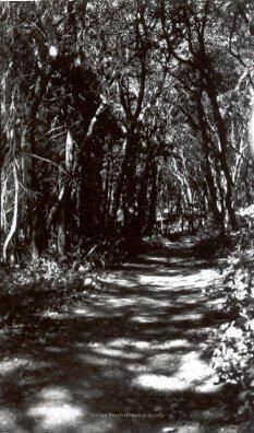 A dirt path is seen dappled by sunlight running through the branches of trees that arch over it. Trees line the path as far as the eye can see.Collection