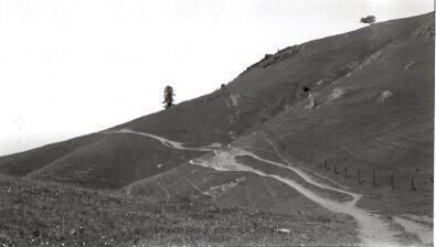 Dipsea Trail etches a path along and over rolling hills before descending over the edge. There is a more distant tree higher on the hill to the right. Wooden fencing stretches along the hill, but separate from the trail, until it disappears over the hillside also. The trail and the fencing diverge into a V-shape in the middle of which stand a Lone Pine Tree.Collection