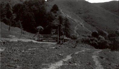 A double dirt track trail runs along the base of and towards a hillside. Slightly higher on the left, separated by weedy growth, is another wider path that has an open swing-type gate across it and wire fencing extending uphill from it. Trees and brush grow at the base of the hill.Collection