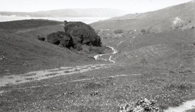 The trail meanders downhill, past an enormous copse of trees (or large rock), to the road (not visible). Some runners dot the trail. Beyond the cleft in the hills forming the horizon one can see Bolinas Bay and peninsula.Collection