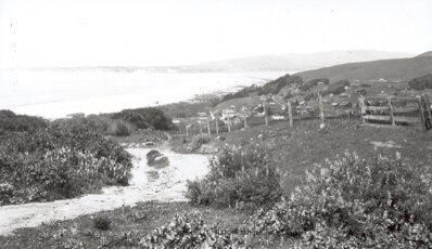 Further down the trail, the dirt track jogs around clumps of shrubbery. A wood and wire fence (with a wooden gate at the top) runs the length of the land as it slopes toward the ocean. Beyond the fencing are various houses scattered about the hillside. Bolinas Bay and peninsula in the distance complete the vista.Collection