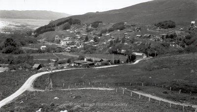 The road leading down to the bridge (from Big Rock near gate) is wide and looks well-maintained. It passes several houses on the left and many more are spread across the hillside up ahead. A dirt path that is delineated by wood and wire fencing runs off to the right, perpendicular to Dipsea Trail. A wooden gate stands at this juncture.Collection