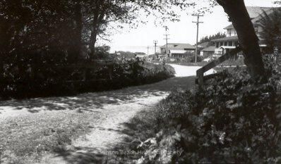 Looking across the bridge from under the trees, the main street curves to the left, past several structures, the first being the largest - a 2-story Sea Beach Hotel with extended porch and ending with the Hotel Airey. The street is also lines with telephone poles as it continues down to the ocean.Collection